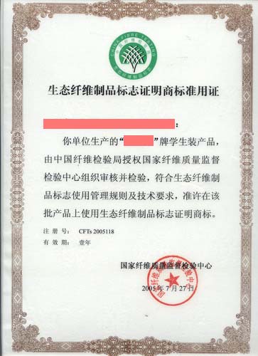1、生态纤维制品标志证明商标准用证(样本):